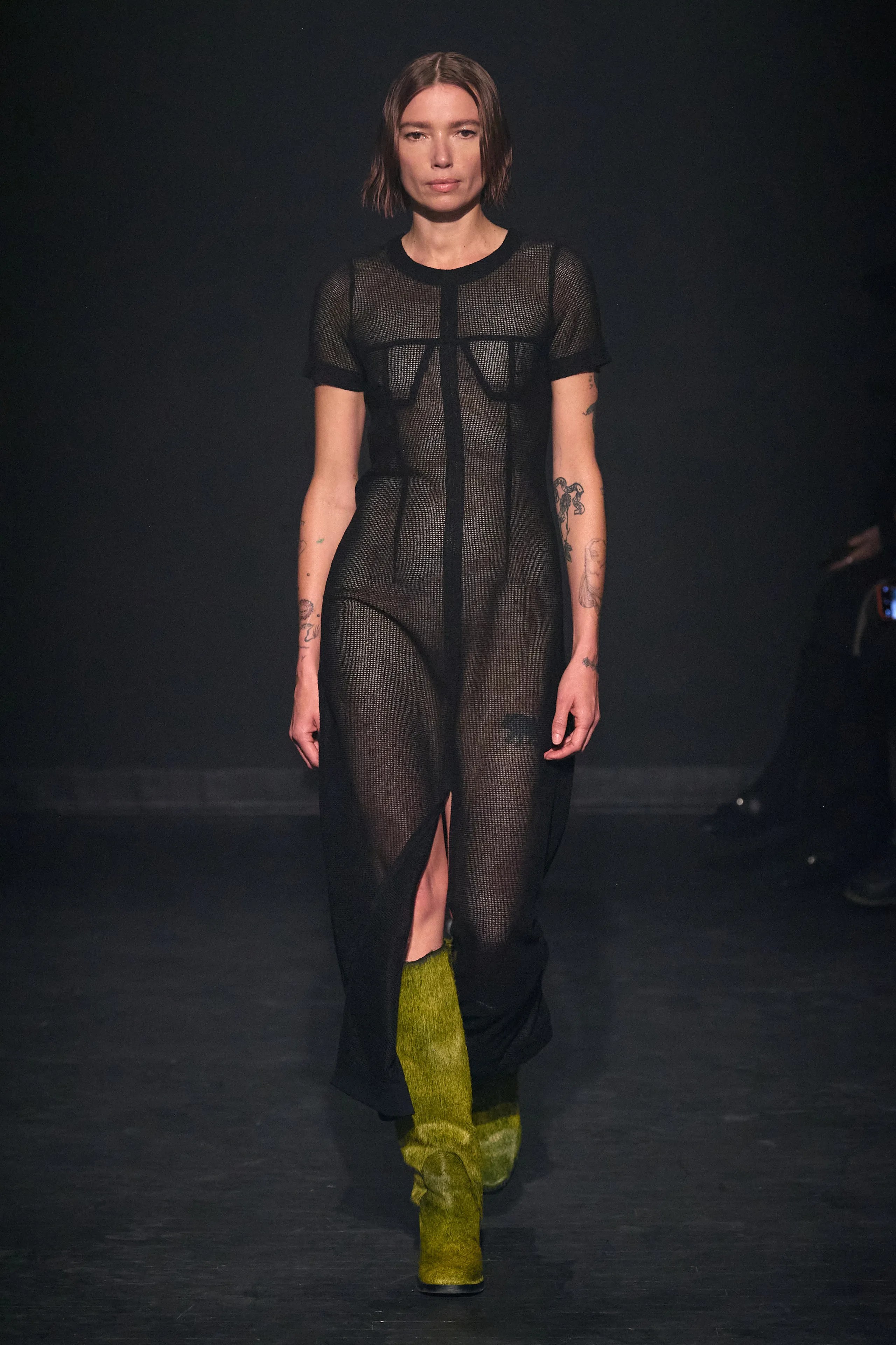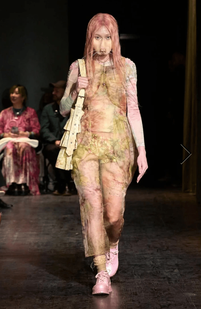 Beginning with the darker pieces in their collection, Zoe Latta and Mike Eckhaus know how to craft a show. As lighter pieces in their capsule headed down the runway artful tailoring could be seen in the gradient pallet of the pieces. Prioritizing fluidity in fashion, many pieces were androgynous with the idea that fashion expression is the purest of them all. White Lotus star John Gries made his fashion week debut appearance in baggy white pants and a pastel lime knit sweater with ink blottings across the front. The show was inspired by the quote “Culture shapes the scripts that expressions of distress will follow”, and in that fashion, models wore an array of functional, casual, and formal wear. Utilizing mesh, fur, and many other textures Eckhaus Latta brought the idea of fluidity to life with a real essence for everyday wear.