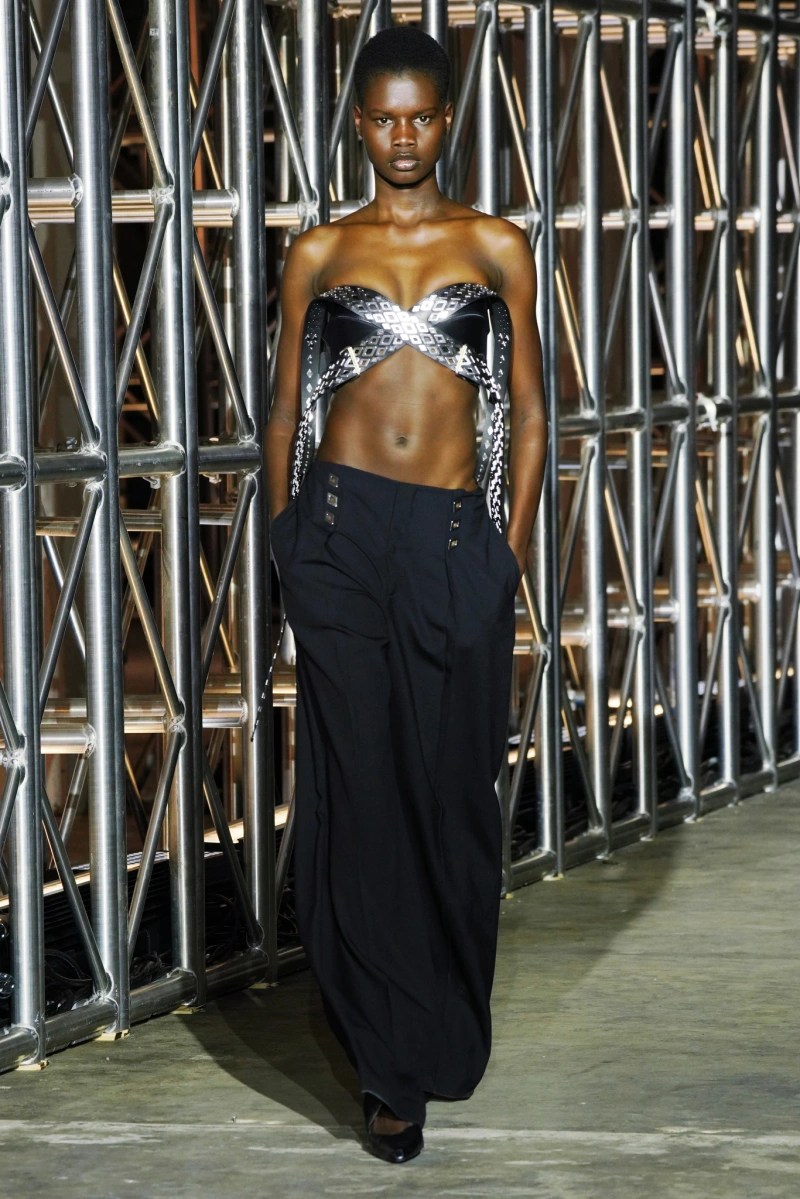 In true fashion, Dion Lee’s NYFW had rave-goers jumping up and down for the collection. Inspired by alter egos, this collection was meant to be a second skin in shedding your outer layers and getting closer to the self. Models wore black netted shirts under-inflated puffer jackets and reptile skin patterns etched into footwear and accessories alike. Base layers were deconstructed, tattered, and falling off to show the death of one’s appearance while finding a more true self. A master at contrasting delicacy with aggression and allure with hostility, this collection was the perfect capsule for Lee. Pieces highlighted the bold underside of the skin someone may not show willingly, and items like the thigh-high reptilian patterned boots, or the tight-fitted fuchsia dress with the pattern of a belly of a snake, were the perfect manifestation of this mantra.