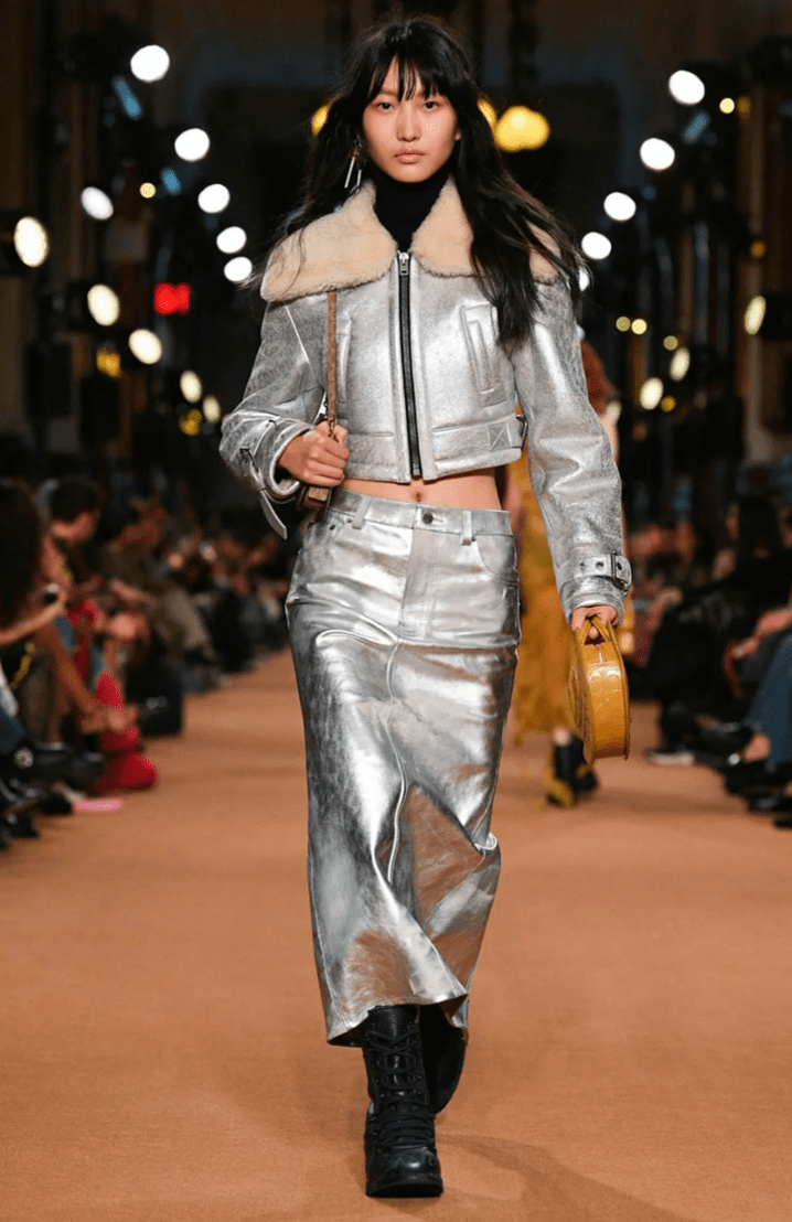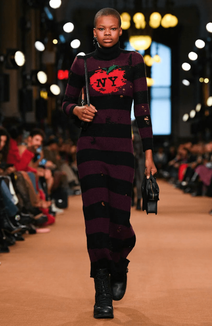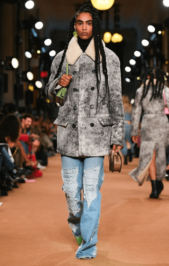 Stuart Vevers, Coach’s head designer since 2013, incorporated textiles like denim, fur, mesh, and sequins to take on a more playful persona rather than the previous more professional/clean-cut looks that Coach is known for. The brown and black patchwork leather jackets paired with a matching skirt, a maxi denim skirt, a long denim jacket, or even a cropped black leather jacket and matching small shorts were just some of the looks taking on Gen-Z’s love for a matching set. It wasn’t just the sets, though, Vevers also touched on monochromatic trends with a brown fur coat and brown jeans splattered with paint, denim maxi skirt trends, the incorporation of multiple textiles like a beige fur coat and ripped denim jeans, and most importantly the DIY, chic but effortless, going out but not going out look everyone is trying to achieve. The edge of an imperfect-perfect look was achieved with acute detail, a maroon and black striped knit tight-fitting dress with a red apple across the front (the perfect homage to NYC) was detailed with small holes across the arms and down the front. Jeans were distressed or dotted with careless splotches of paint, the metallic leather sets were “worn in” with just the right amount of shine, appealing perfectly to the Gen-Z desire to try but not show you tried, care but not show you cared.