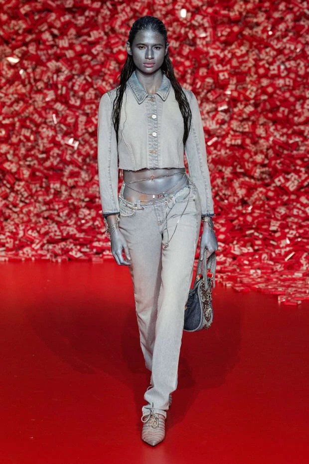 Diesel boldly decked out their set with thousands of condoms, dropping jaws everywhere. Does it really matter what’s to come when the runway is lined with condoms? Models in very Y2K-esque outfits strutted down the runway to loud music wearing. The looks featured things like low-rise jeans, metallic tops, see-through jean maxi skirts lined with mesh, and distressed business suit sets. The message was clear, much like the contraceptive memento; be safe and have fun.