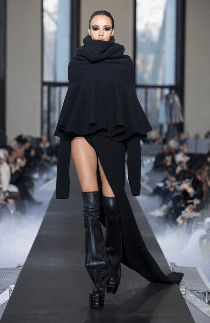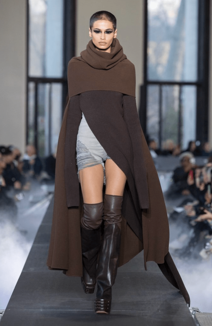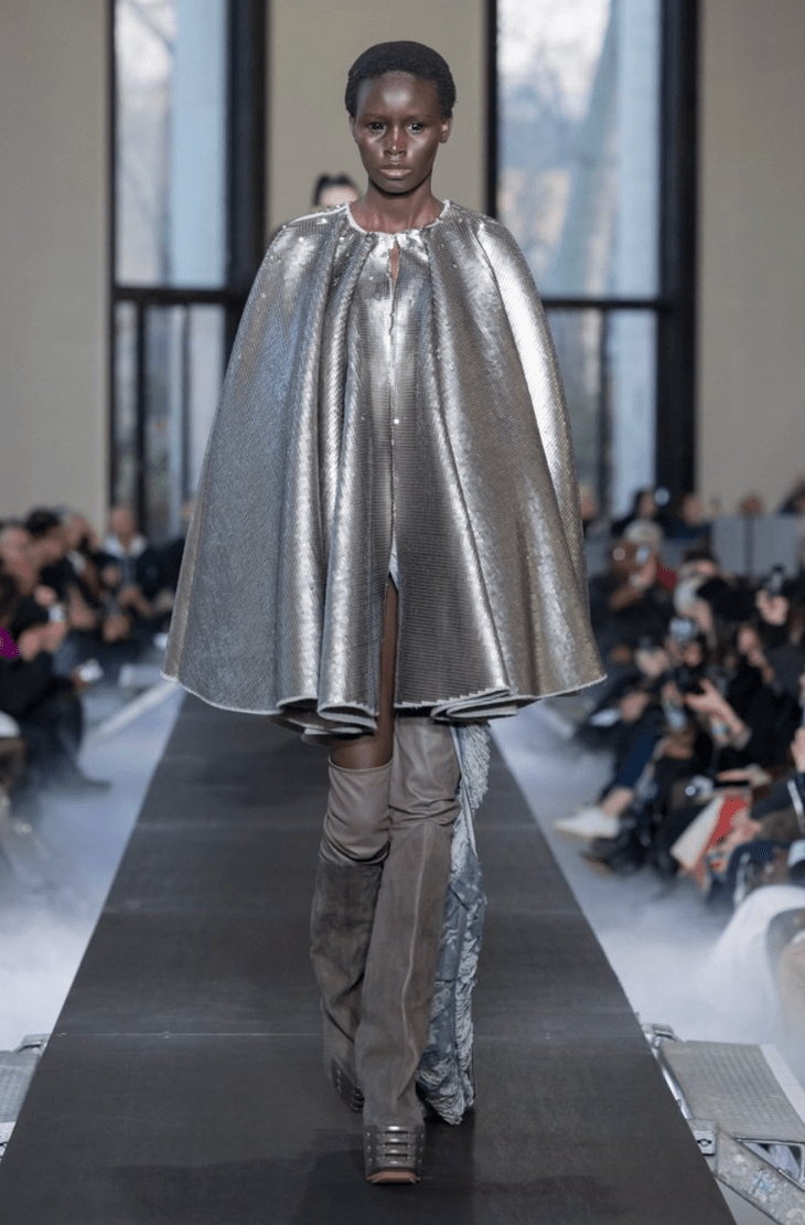 Playing with the silhouette, Rick Owens designed pieces that accentuated shoulders with puffy top heavy coats. Most of the looks carried their weight on top with bubble-like shoulder pads and scarves, exposing bare legs beneath paired with thigh-high leather platform boots. While much of the collection was crafted with darker tones, the pieces that were colorful used jewel tones and metallic pinks and greens.