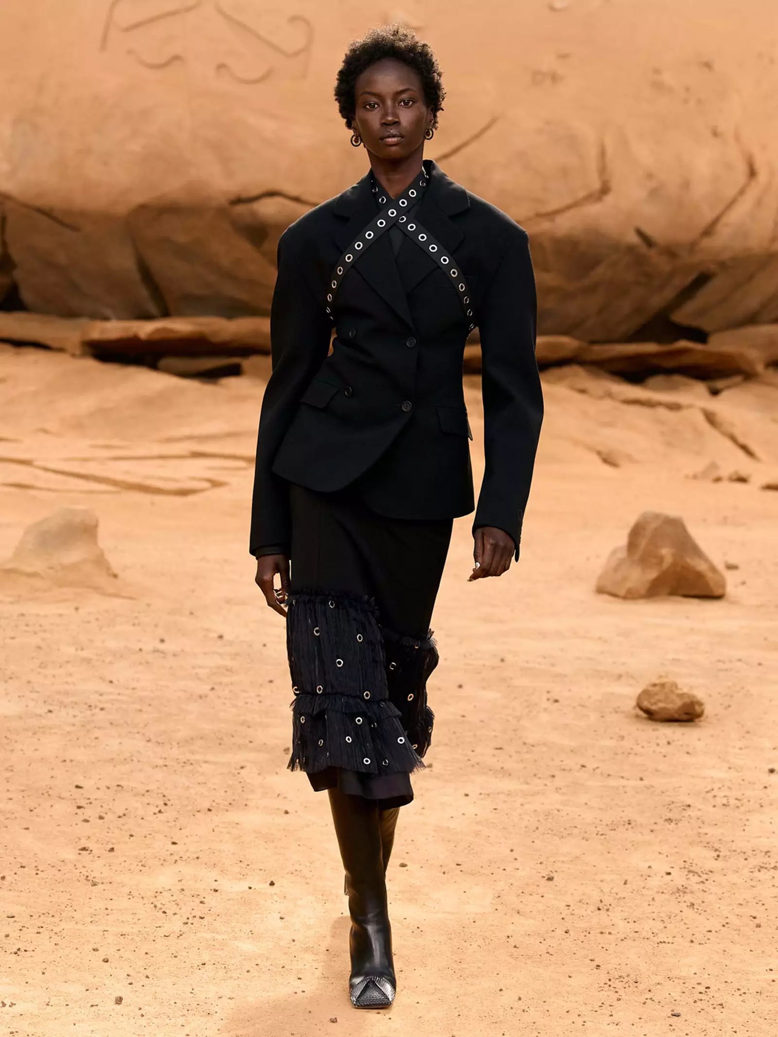 Ib Kamara is the name on everyone’s lips at his debut appearance for Paris Fashion Week. Kamara was also named Dazed Magazine’s chief in 2021; as both of these roles require the utmost care and attention, it is safe to say he has not disappointed in either. With big expectations from Off-White fans and Virgil Abloh lovers alike, Kamara understood the pressures, referenced past collections, and did not disappoint. Set against an intergalactic backdrop, models walked the deserted space land in black flow-y dresses detailed with metal adornments that could be found on most pieces. Along the same vein of utilitarianism we’ve been seeing all season, puffer jackets featured thick furry belts, a silver metallic dress layered under a leather harness, and multiple pieces with huge zipper runnings across the front.