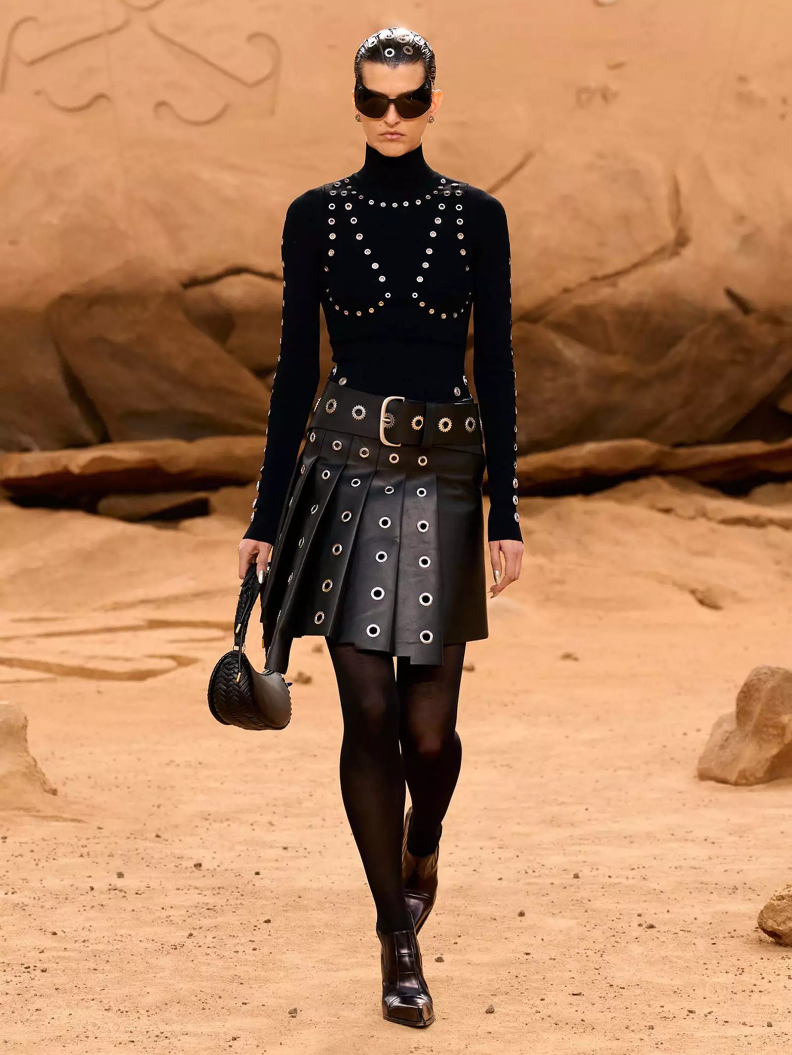 After Coperni went viral last season for spraying a white dress on a mostly naked Bella Hadid, there was a lot to measure up to. And while the clothes featured low-waisted pants with leather cut-out tops and red tights paired with black and white long-collared shirts; once again, everyone is talking about the use of technology with fashion. Robots walked down the runway with models, handing them accessories and even taking a model’s jacket and holding it for her as she strutted the rest of the catwalk.