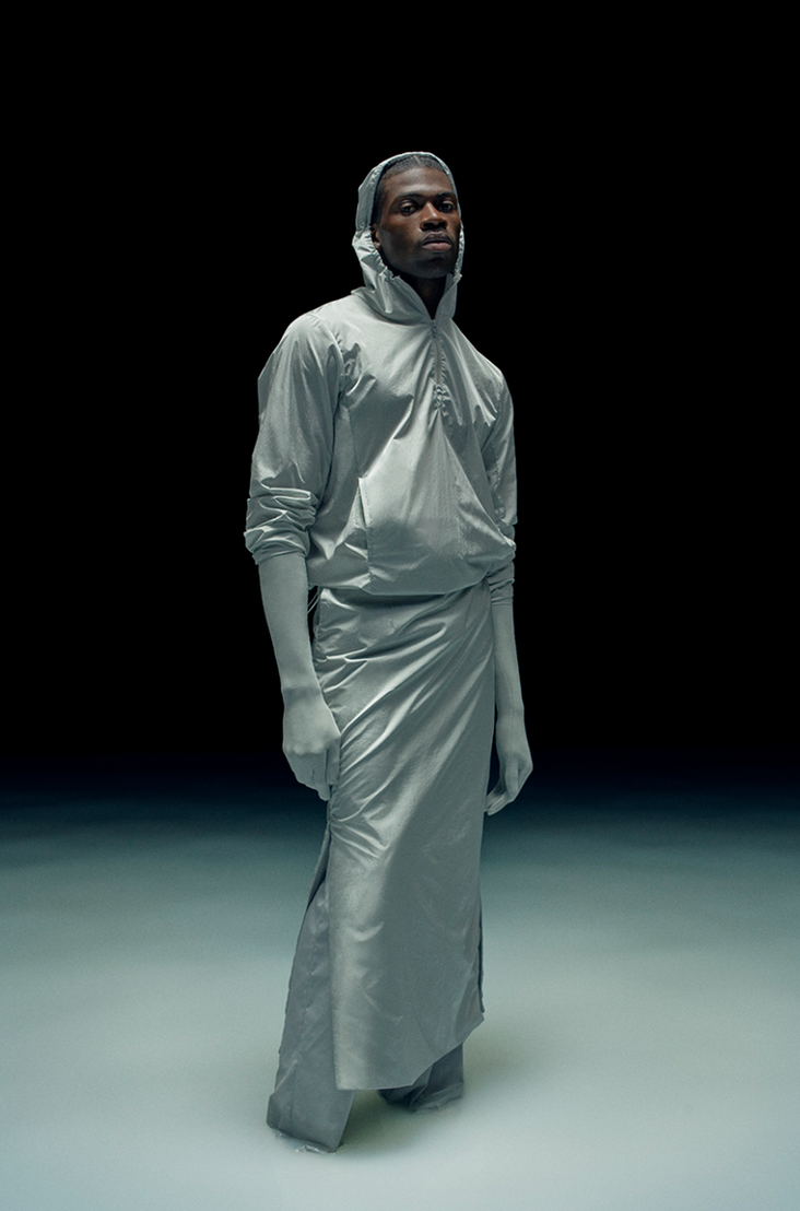 Another collection emphasizing wearability, Chimi drops a collection full of luxury athletic wear made for any gender. Monochromatic looks are consistent throughout the collection, matching dark zip-up jackets with low-rise maxi skirts. Textiles range from jersey material in the form of long formal dresses to light windbreaker material in hooded jackets and matching skirts. The Creative Director, Charlie Lindström, added that he wants the collection to be worn in everyday routines and rituals.